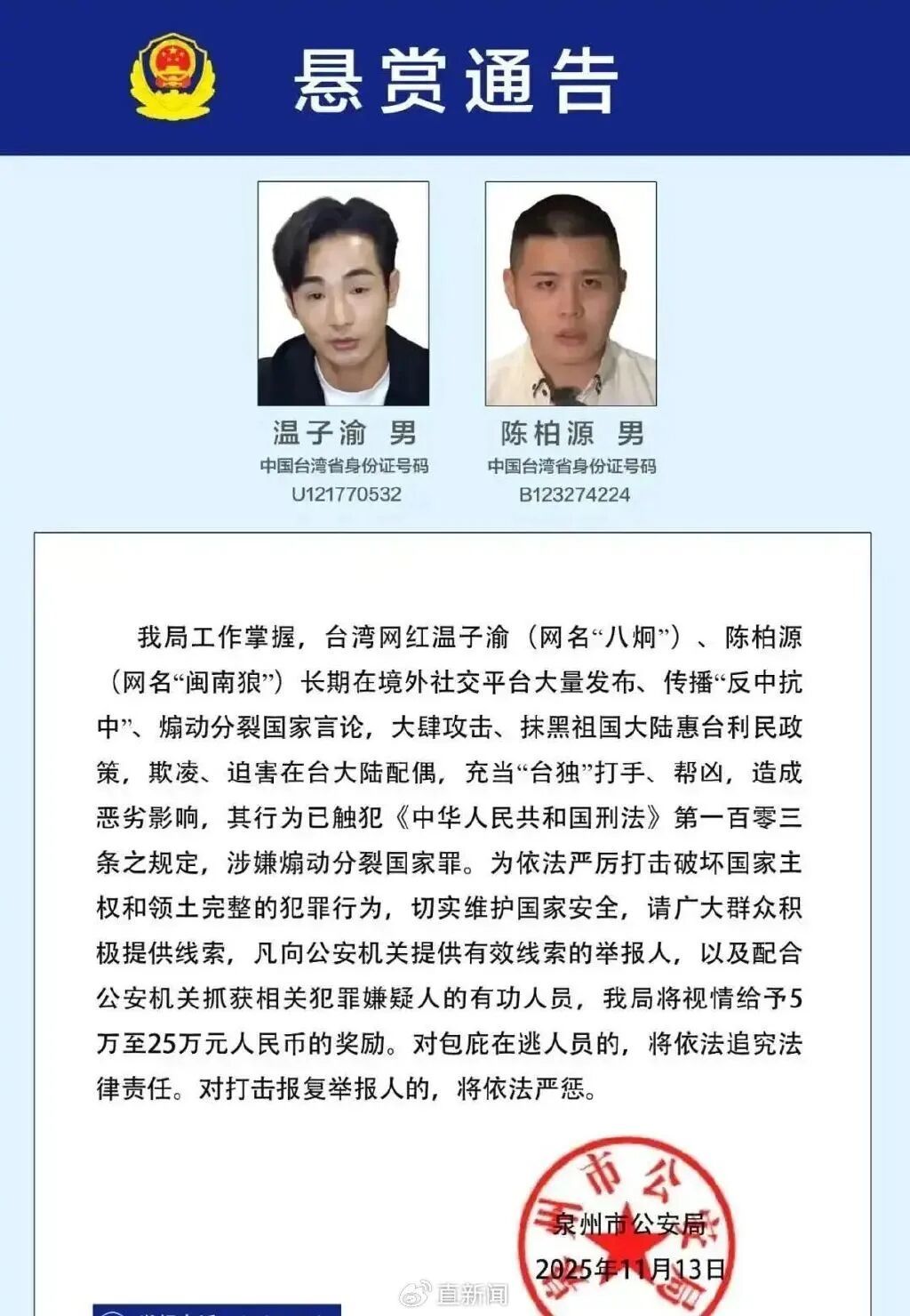 福建省泉州市公安局11月13日发布了一则悬赏通告,公开征集台湾网红温子渝(网名“八炯”)和陈柏源(网名“闽南狼”)涉嫌煽动分裂国家的违法犯罪线索。没想到,通告一出,这两人不仅没有丝毫悔意,反而上演了一出荒诞的“回应秀”。